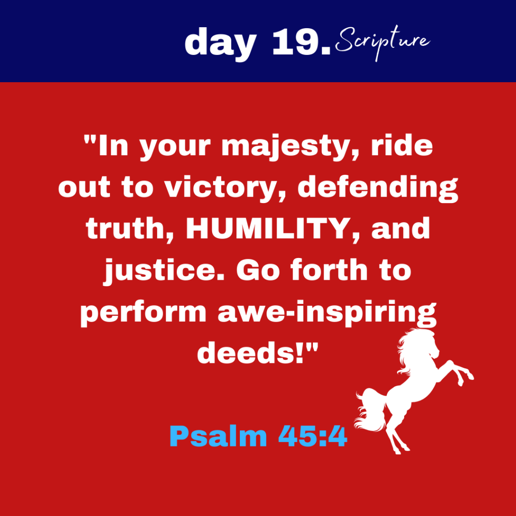 Psalm 45:4 (NLT) “In Your majesty, ride out to victory, defending truth, humility, and justice. Go forth to perform awe-inspiring deeds!”